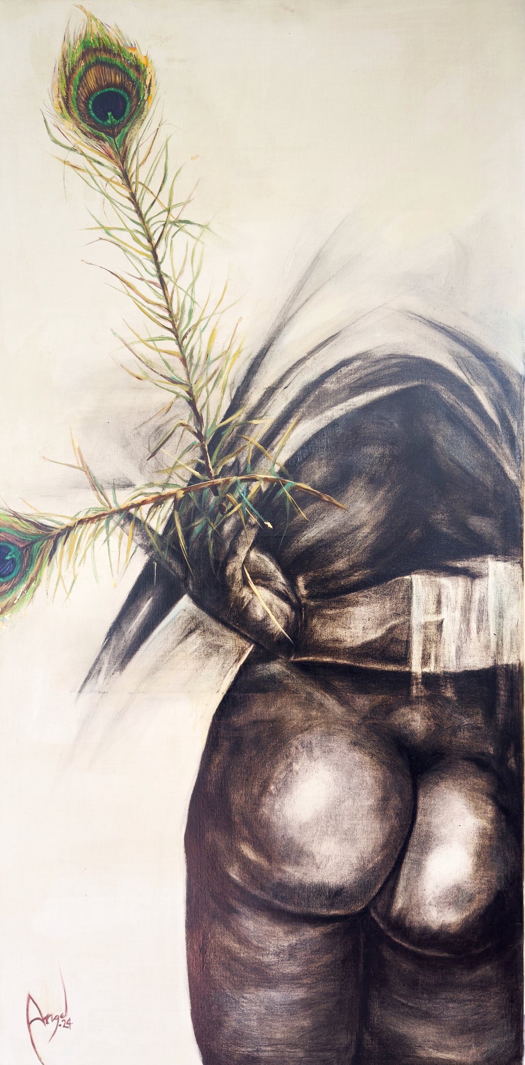 El cuerpo atravesado por fuerzas opuestas: ascenso y caída, impulso y peso, deseo y trabajo. Los elementos simbólicos operan como restos de un imaginario ritual que sitúa al cuerpo en tensión con la idea de elección y destino.